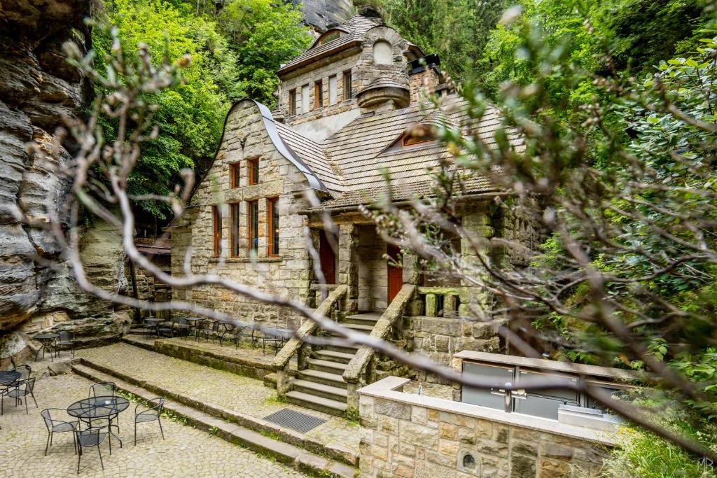 The pretty wooden building huddling near the cliff next to the gate is the Falcon’s Nest Restaurant from the 1880s. It’s still active, so you can stop inside for a snack and or have one of Bohemia’s famous lager beers at one of the outdoor tables, like we did.
