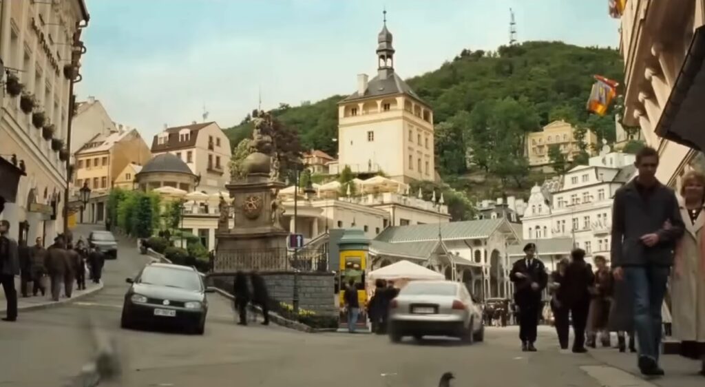 Bond’s and Vesper’s car proceeds to drive into the southern end of the same road (here called Tržiště), past the Holy Trinity column. In the background, you can prominently see the castle tower, the only remainder of the original 14th-century castle that once stood here.