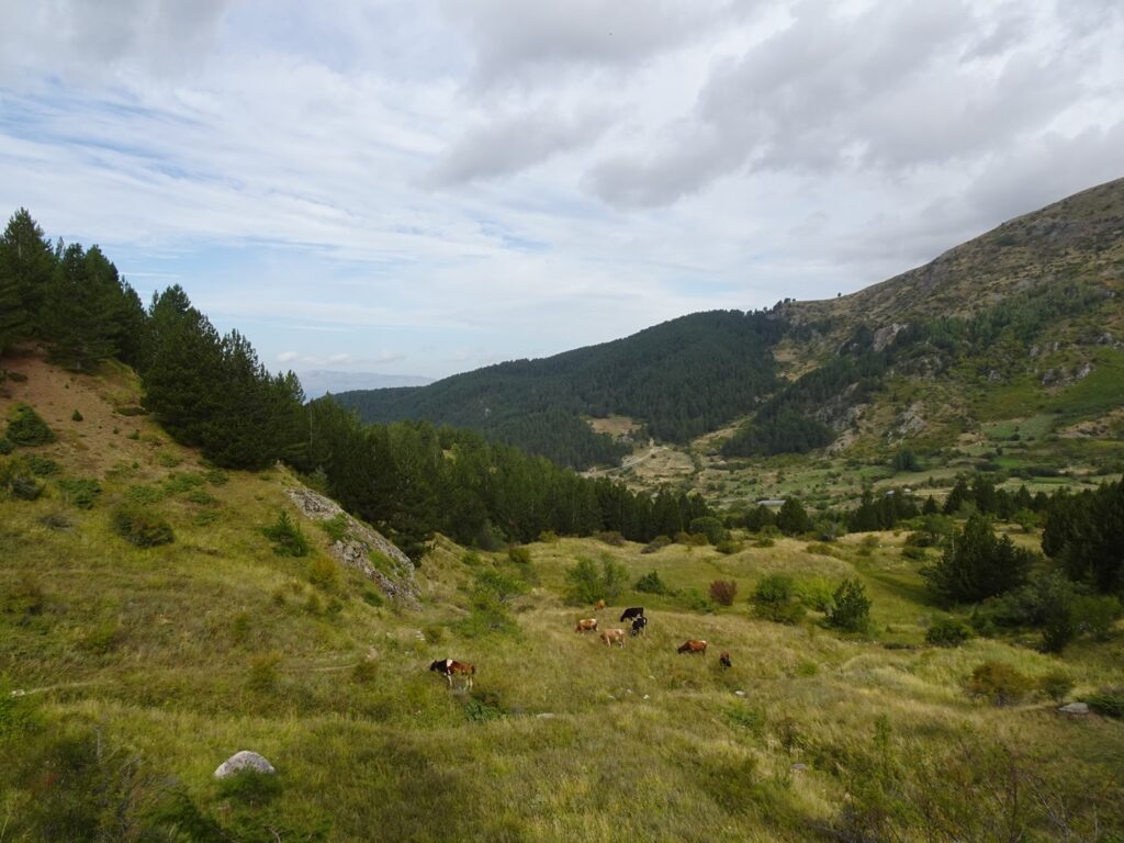 We picked the southern option on our way up the mountain and the northern one on the way back. The first part of the trail leads past some hilly pastures with grazing cows and through some small, pretty patches of pine trees. It’s worth turning around once in a while, as the view back west to Radomirë and beyond is pretty good right away.