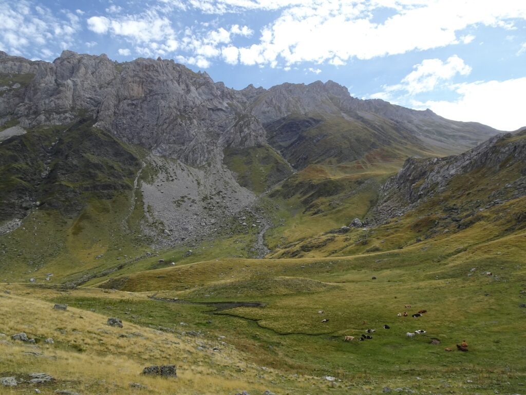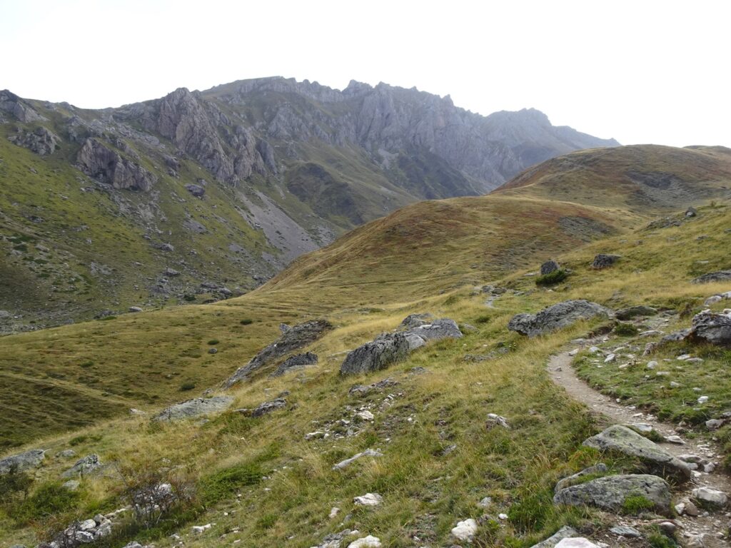 At one point, you’ll have to cross a small stream, but as there are enough rocks to step on, it’s easy enough. Soon after, the two trails that split at the beginning merge and continue climbing together south-east into more rocky alpine terrain.