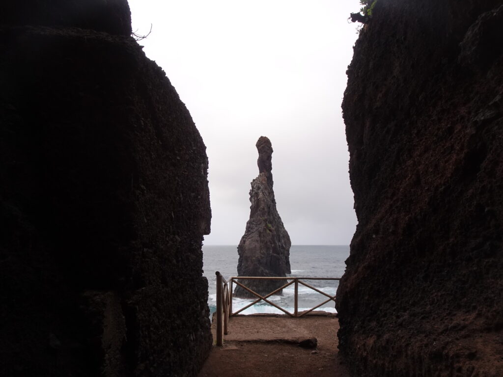 To get there from Ribeira de Janeila, you’ll just have to follow the ER209 into the mountains for about 10 minutes. From the big parking spot at the eastern end of the Fanal Forest (at N32°48.518 W17°08.648), you’ll have to walk roughly in a north-easterly direction and up a steep slope. At some point, you’ll see the characteristic rock outcrop that’s in the background of the scene.